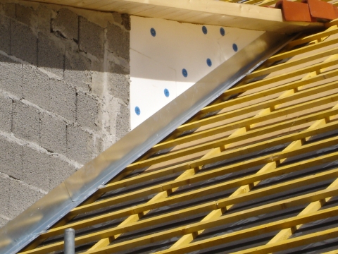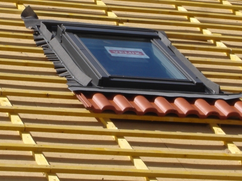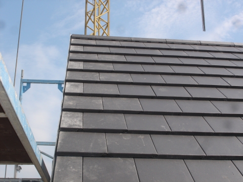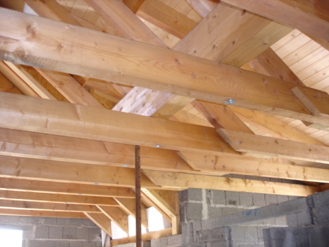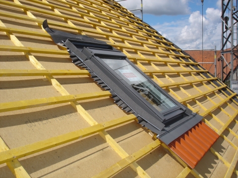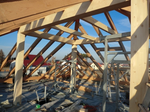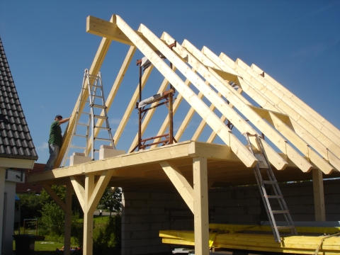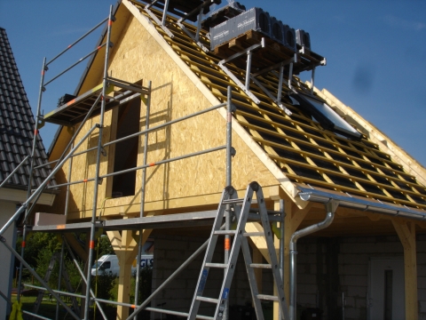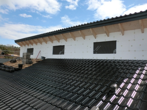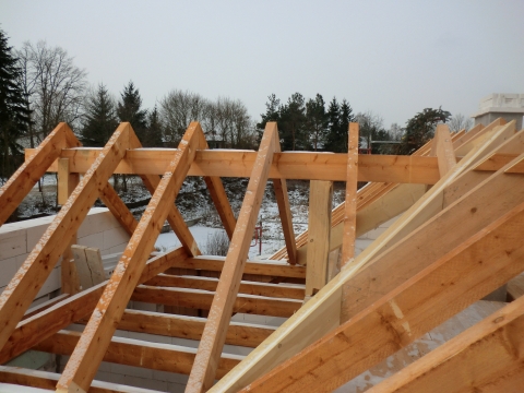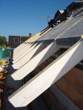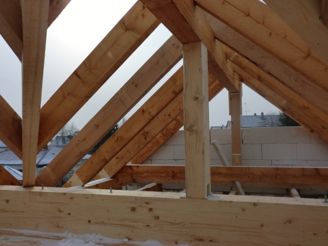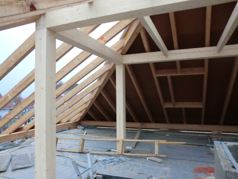 Pfettendachstuhl mit Holzfaserunterdeckplatten und Tegalit Betondachsteinen mit Schneefangrohren aus Alu -