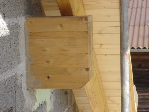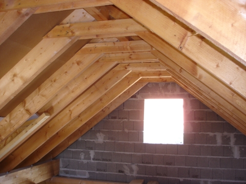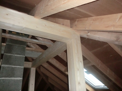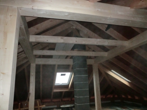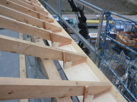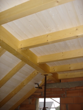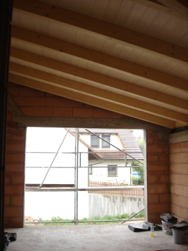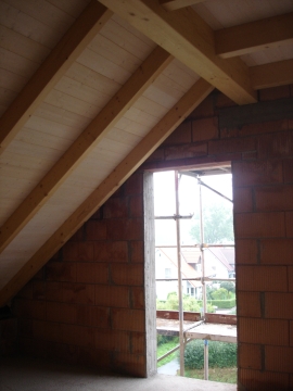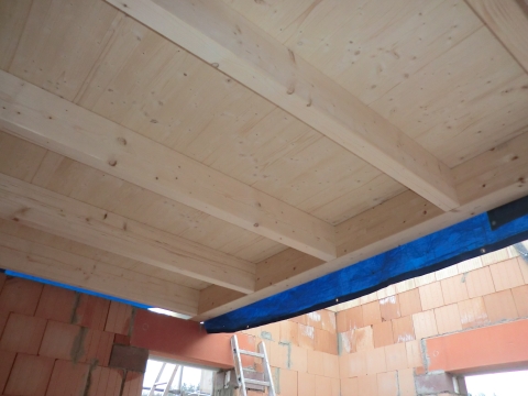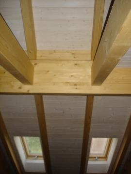 Versetzte Pultdächer mit Hozlbalkendecke (teilweise sichtbar), Zwischenwand in Holzständerbauweise -